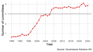 In der Praxis ist die Zahl der Verwaltungsratsausschüsse deutlich gestiegen: Bei SMI-Unternehmen nahm die durchschnittliche Anzahl der Ausschüsse von 0,63 im Jahr 1988 auf 3,85 im Jahr 2024 zu. Dieser Anstieg setzte bereits vor der Publikation des Swiss Code ein.